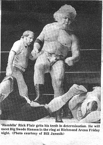'Ramblin' Rick Flair grits his teeth in determination. He will meet Big Swede Hanson in the ring at Richmond Arena Friday Night.
