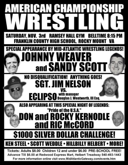 The wrestling show that night was the culmination of a storyline that had begun in the spring of this year in both Ken Steel's NICW promotion in Floyd VA as well as Eclipso's ACW in Rocky Mount. While ACW Universal champ Eclipso had refused to give Sgt. Jim Nelson another title shot, Johnny Weaver tricked Eclipso and manager Douglas J. Wentworth into signing a contract for a title match that night, which Nelson won. Weaver presented Nelson with the title belt in the ring, and Wentworth went nuts, threatening Weaver. When Eclipso tried to sucker punch Weaver, Johnny blocked the punch, shot Eclipso into the ropes and locked on his famous sleeper hold, to a big reaction from the crowd. In the next moment, Nelson caught Wentworth in the Cobra Clutch (taught to him by Sgt. Slaughter, of course), and the former champ and his manager were left nearly lifeless in the ring. Referee Ric Petty had to wake Eclipso up from the sleeper, just as Sonny Fargo might have done 20 years ago. Wentworth, on the other hand, may still be lying unconscious in that ring at Franklin County High School. The crowd was up from a normal ACW show, according to the promoter of the event. There are usually 75-100 paid at the shows in Rocky Mount, and if you attend independent wrestling shows, you know that's actually a pretty decent paid crowd. At this venue, the only seats are one set of bleachers along one side of the gym. I'd guess there were just under 200 there for this show, by 8:45 PM, the bleachers looked about full. Jim Nelson's parents were on hand that night and got to see their son's hand raised by the great Johnny Weaver. They also enjoyed a reunion with Don Kernodle who they had not seen in over 20 years. Kernodle had stayed with Jim at his parents home during the days the two were Mid-Atlantic tag team champions, Sgt. Slaughter's prize Marine recruits. It's worth noting that Eclipso is a veteran of the Mid-Atlantic area as well. Although never having worked for Crockett Promotions, Eclipso has been working and running independent shows since the late 1970s. He and Nelson and Ric McCord all broke into the business about the same time, and Eclipso has run shows in Virginia for over 25 years. He and McCord have huge collections of old wrestling posters from the 1970s, from the Greensboro Coliseum and the Starland Arena in Roanoke, featuring some of the biggest shows in those two building's history. McCord even entertained some of us with some photos of his collection that he had on his cell phone. I was marking out for them, as I love those old event posters.