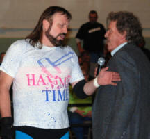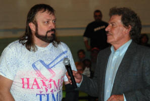 Another wonderful get-together in Rocky Mount, this time to pay tribute to one of wrestling greatest legends, Johnny Weaver. Weaver passed away February 15, 2008 at the age of 72. His daughter Wendi along with several of Weaver's peers from the 60s, 70s, and 80s gathered in Rocky Mount to pay tribute to him on the one year anniversary of his final appearance in a wrestling ring. Exactly one year ago this weekend, Johnny Weaver appeared as part of a huge "Night of the Legends" event in Rocky Mount that featured Weaver along with Sandy Scott, Don Kernodle, Jim Nelson, Keith Larson (Rocky Kernodle), Ric McCord, and Eclipso. Weaver, still in excellent shape at the age of 72, hit the ring at the end of the show and locked on his famous trademark sleeper on bad guy Eclipso to end the show that night, much to the delight of the many fans. Friends and members of the Mid-Atlantic Mafia surprised Weaver after the show with a birthday party and special gathering. It was a special weekend for all those involved. (See photos and report here.) Little did we all know, it would be the last time many of us would see Johnny Weaver. A few months later, Johnny passed away at his home in Charlotte NC. His death was unexpected; he had just recently passed his physical for the Mecklenburg County Sherriff's Department, where he was a deputy and was looking forward to retirement in less than two years. His death stunned his family, the wrestling community, friends, and long time fans. This 2008 event for ACW, called Night of the Legends II, was also a special tribute to Johnny Weaver, with many of the folks that worked with him both in the ring and behind the microphone in attendance to help honor him, including wrestling legend Sandy Scott and Johnny's first broadcast partner in the late 1970s Rich Landrum, who hosted World Wide Wrestling for Jim Crocket Promotions from 1978-1982. Landrum was the special announcer for the Weaver tribute, and even joined in commentary for the taping of the event. Weaver's close friend Blackjack Mulligan sent in a special video greeting to all the fans in Rocky Mount and offered his special tribute to Johnny as well.