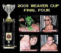 The final match of the 2009 Johnny Weaver Memorial Tournament began as the Kamakazi Kid was introduced and made his way toward the ring. The second finalist, "the 1st" Ric Converse, didn't wait for an invitation, attacked before the masked fan-favorite could get to the ring. After a few moments the referee called for the bell and began counting until both men entered the ring. Converse started fast, even allowing manager Cross a handful of shots at his masked opponent before deciding that this match was near its end. Hoisting Kazi up for his Ric-Tor Scale finisher, Converse looked totally baffled as the masked star slid out of his grasp and behind him, locking on the move made famous by Johnny Weaver, the sleeper. Converse tried to fight back, but Kazi finally got him down to one knee and finally rolled over on the canvas. Referee Redd Jones kept a close eye on the five time former heavyweight champion and at the 8:32 mark of the no timelimit final made the decision that Converse was no longer capable of defending himself and called for the bell.